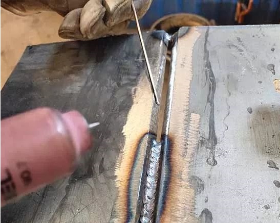 焊丝在进入熔池时,要避免与钨极接触短路,以免钨极烧损落入熔池,引起焊缝夹钨。焊丝末端不要伸入弧柱内,即在熔池和钨极中间,否则,在弧柱高温作用下,焊丝剧烈熔化滴入熔池,引起飞溅并发出乒乒乓乓的响声,从而破坏了电弧的稳弧燃烧,结果会造成熔池内部污染,也使焊缝外观不好,灰黑不亮。